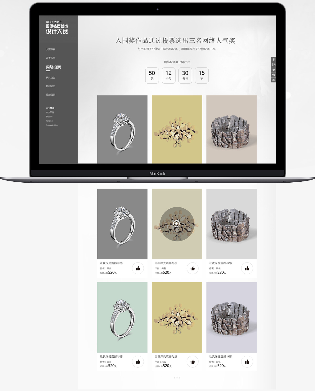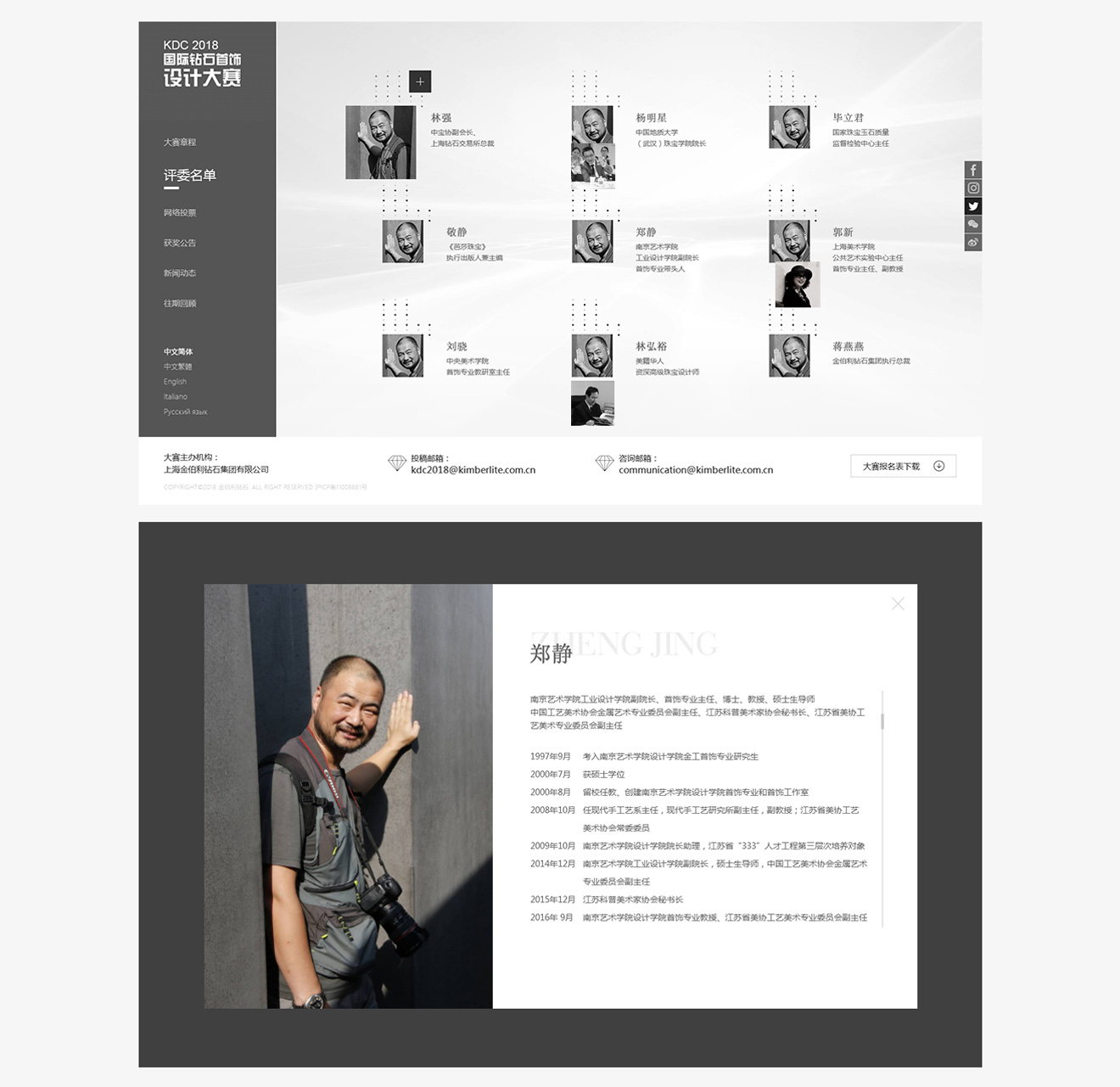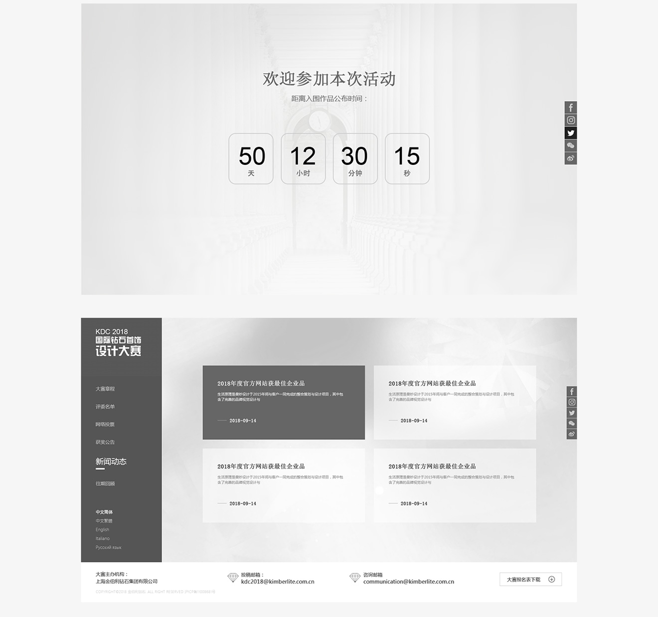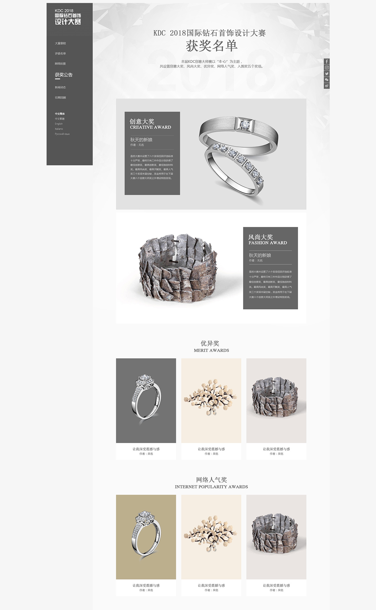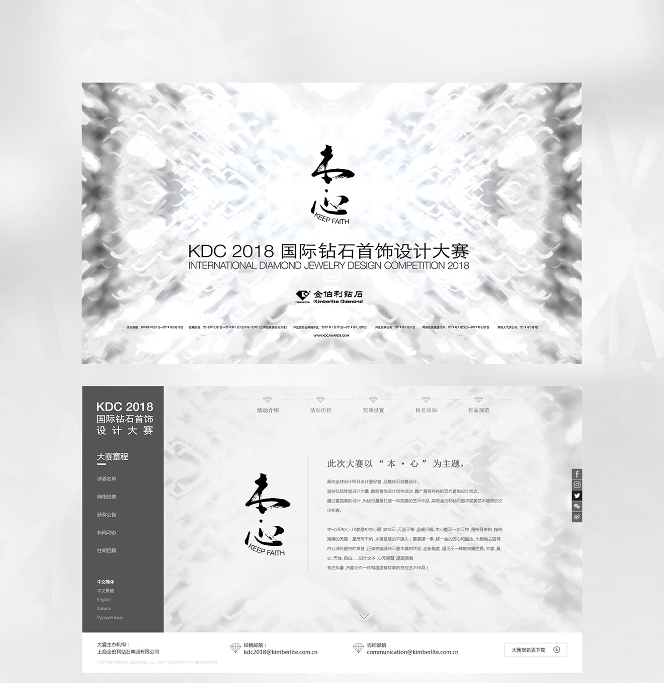 KDC2018 國際鉆石首飾設計大賽以本心為主題的首飾珠寶設計大賽,網站界面簡潔,用白灰黑三種顏色來體現一種本色、本心、真我使活動整體頁面更貼近本次活動主題。