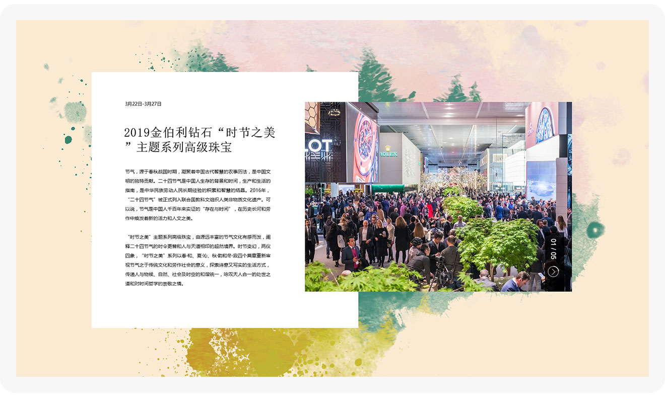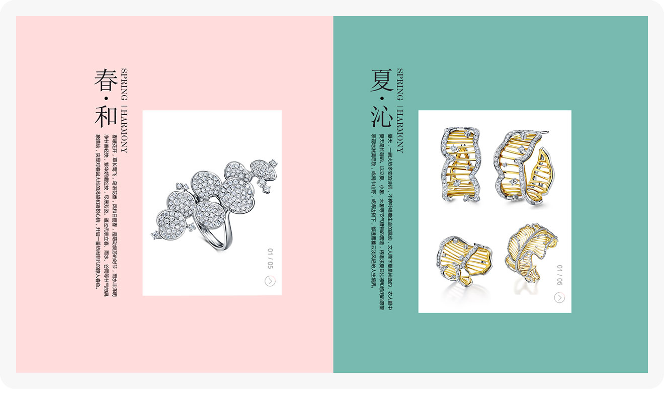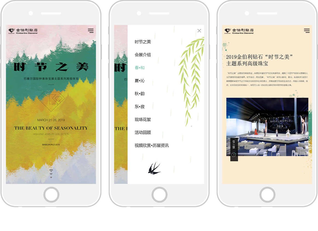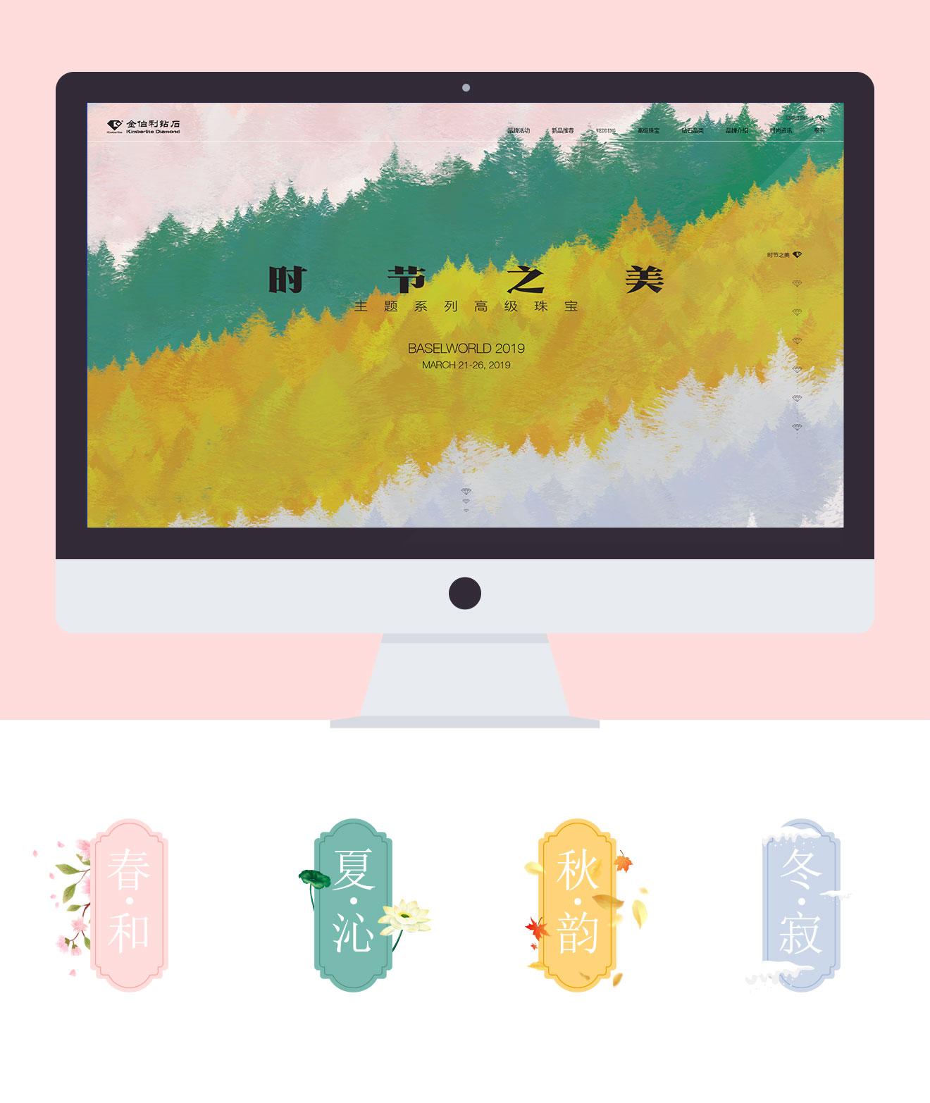圍繞金伯利巴塞爾活動主題“時節之美”的一個活動專題,展示四個季節對應的高級珠寶,頁面整體風格用簡潔干凈的版面和不同季節的顏色來突出四季的不同變化,每個季節對應的插畫來體現春、夏、秋、冬。