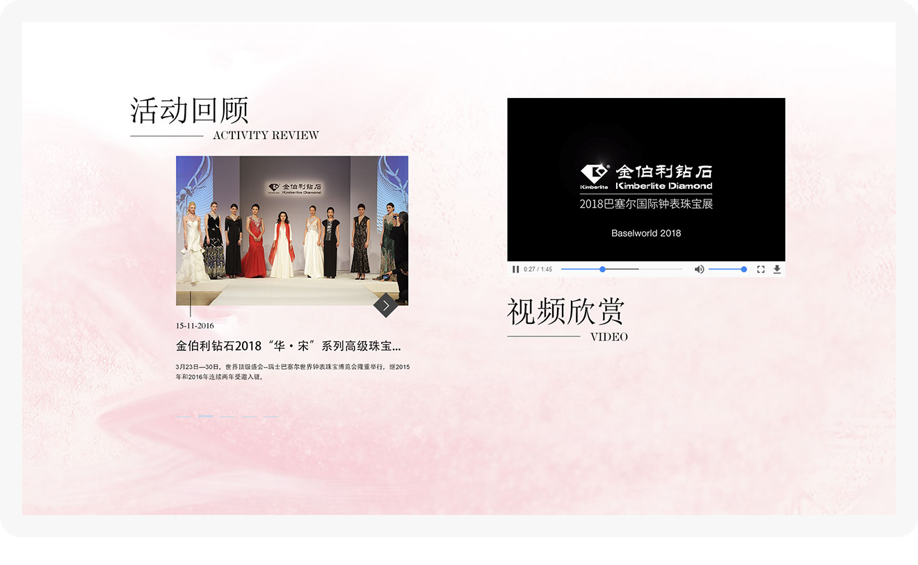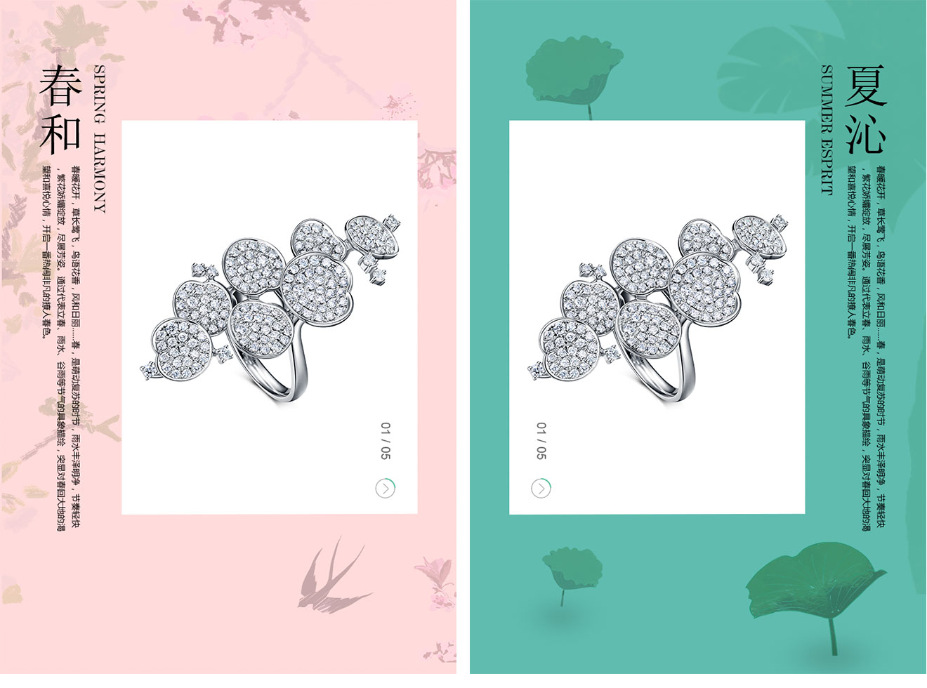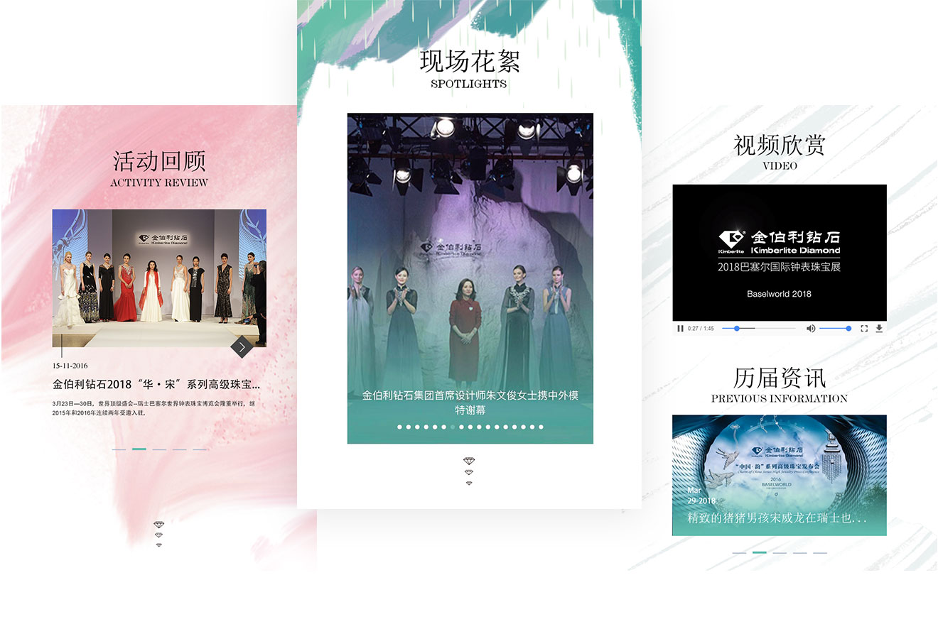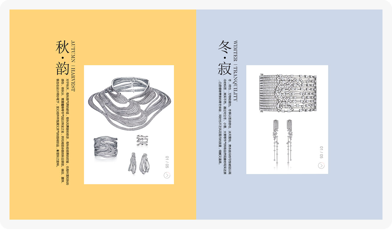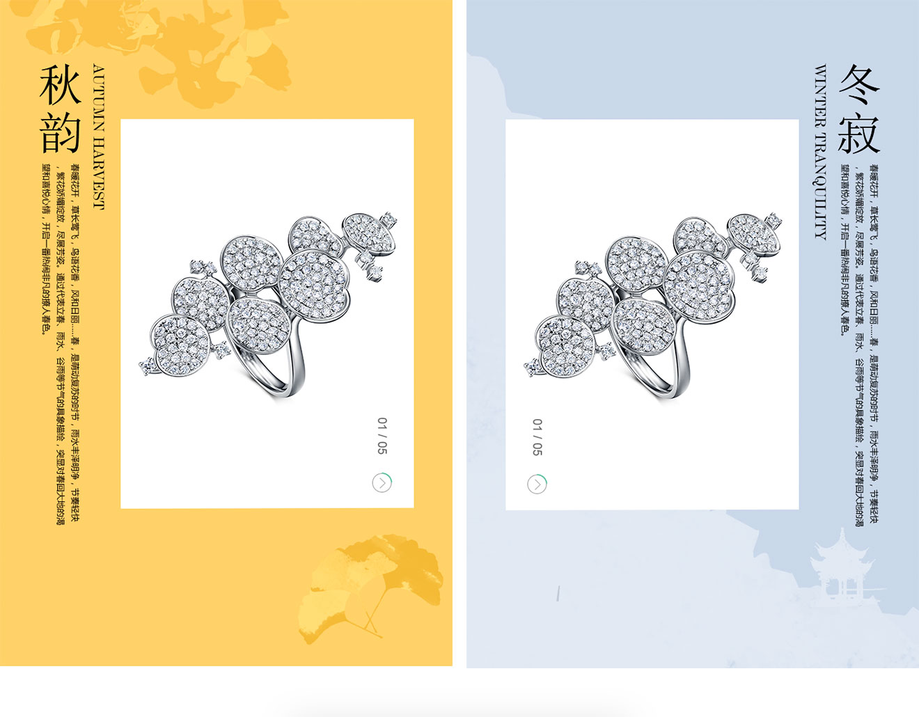 圍繞金伯利巴塞爾活動主題“時節之美”的一個活動專題,展示四個季節對應的高級珠寶,頁面整體風格用簡潔干凈的版面和不同季節的顏色來突出四季的不同變化,每個季節對應的插畫來體現春、夏、秋、冬。