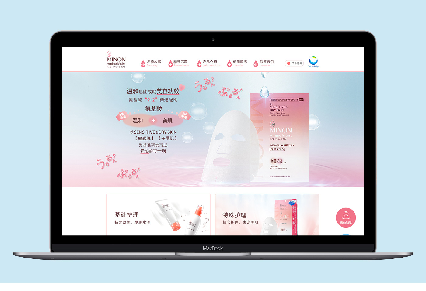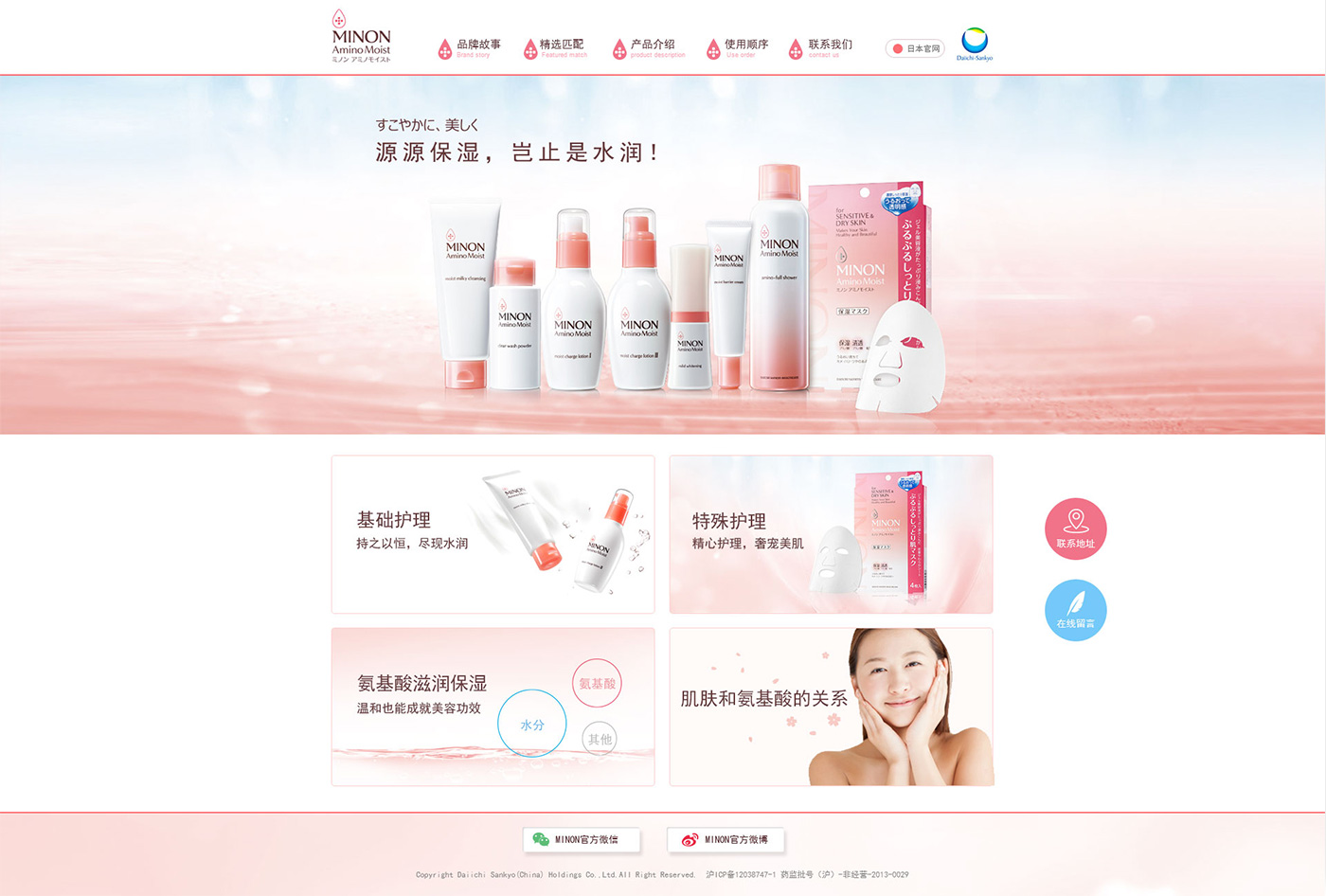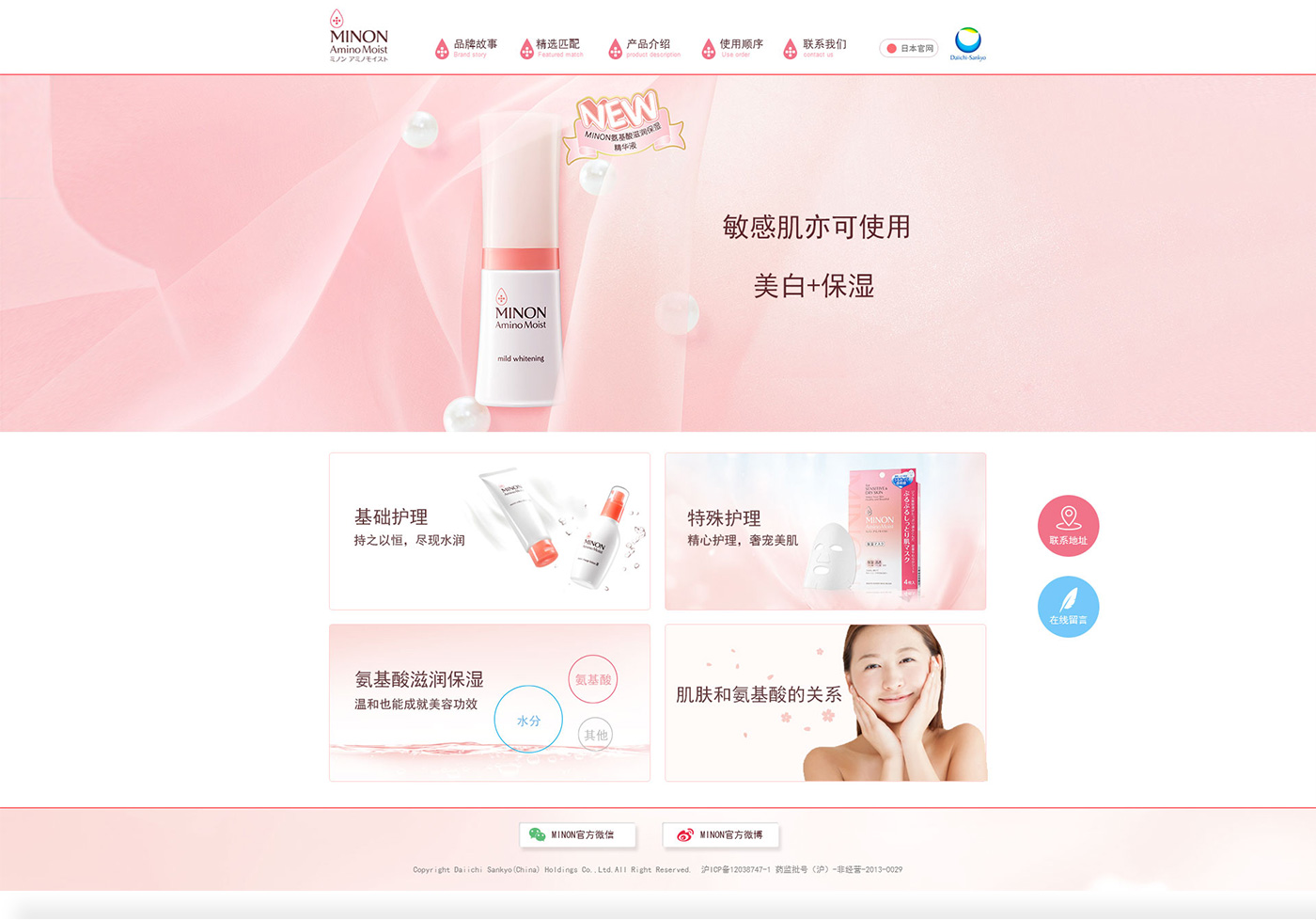 美容護膚品官網建設,網站以主體的顏色給用戶溫馨的氣氛,根據LOGO衍生輔助圖形使品牌辨識度增加。