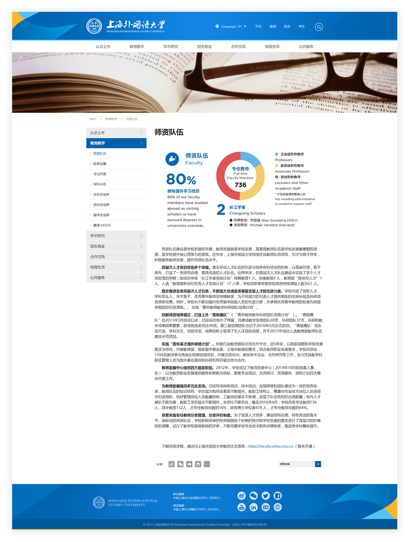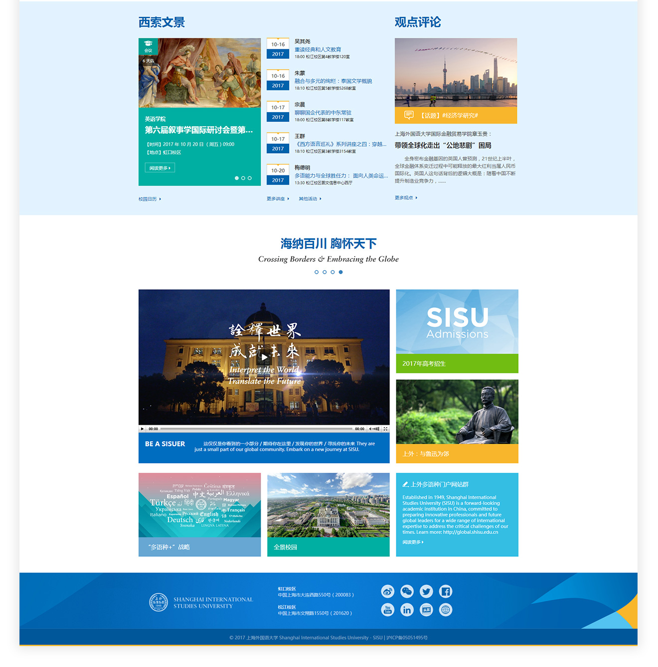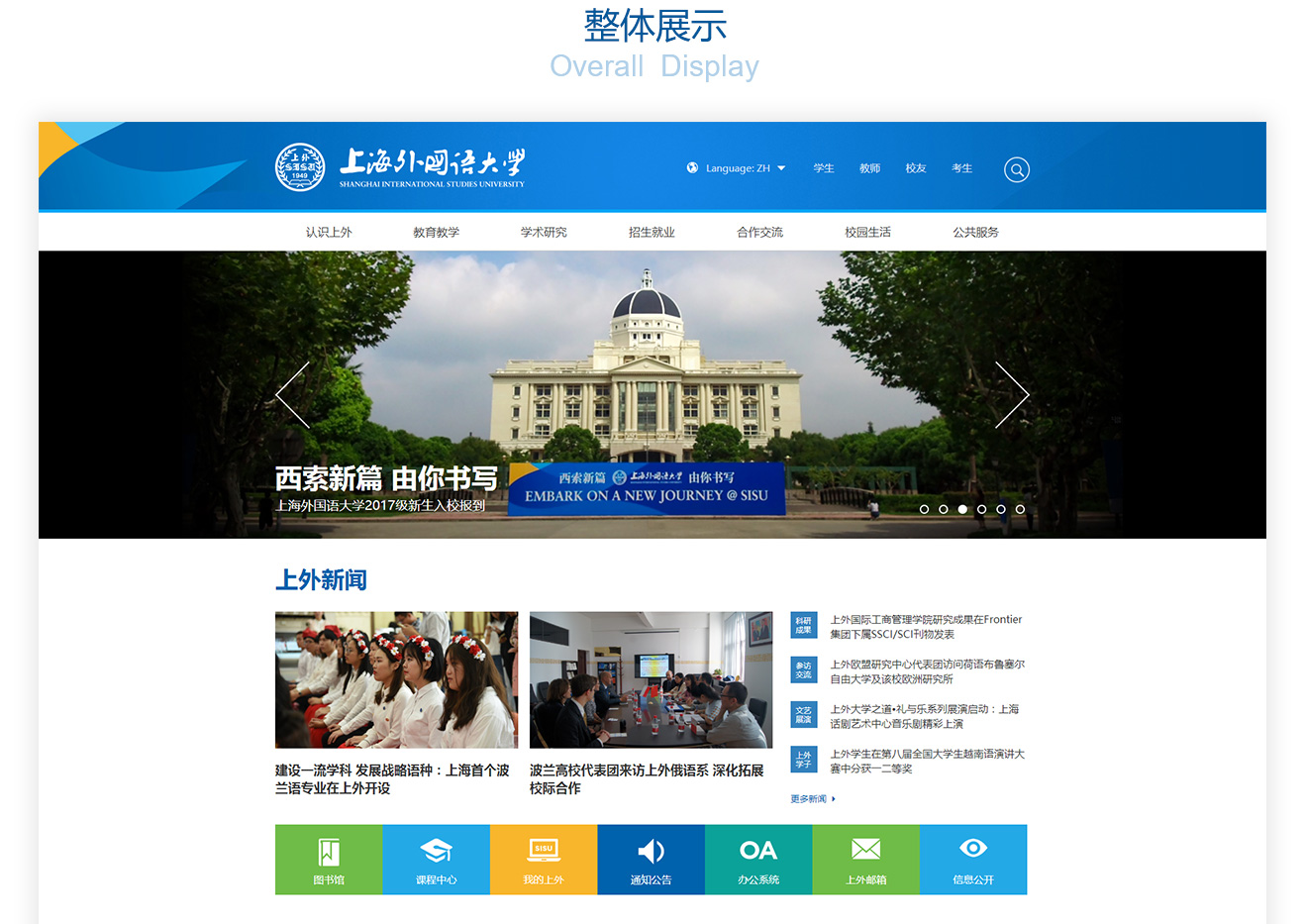 上海外國語大學(xué),簡稱“上外”、 “SISU”,是教育部直屬并與上海市共建、進(jìn)入國家“211工程”建設(shè)的全國重點(diǎn)大學(xué),秉承“格高志遠(yuǎn)、學(xué)貫中外”的校訓(xùn)精神,篳路藍(lán)縷,奮發(fā)有為,現(xiàn)已發(fā)展成一所培養(yǎng)高端國際型外語人才的多科性、國際化、高水平特色大學(xué),蜚聲海內(nèi)外。網(wǎng)站自適應(yīng)PC/手機(jī)/pad終端,真正實(shí)現(xiàn)了多屏互動。新版的上外外文站在全國眾多高校外文網(wǎng)站建設(shè)的大趨勢下起到了示范性作用,同時也極大的提升了上外在國際上的品牌形象。