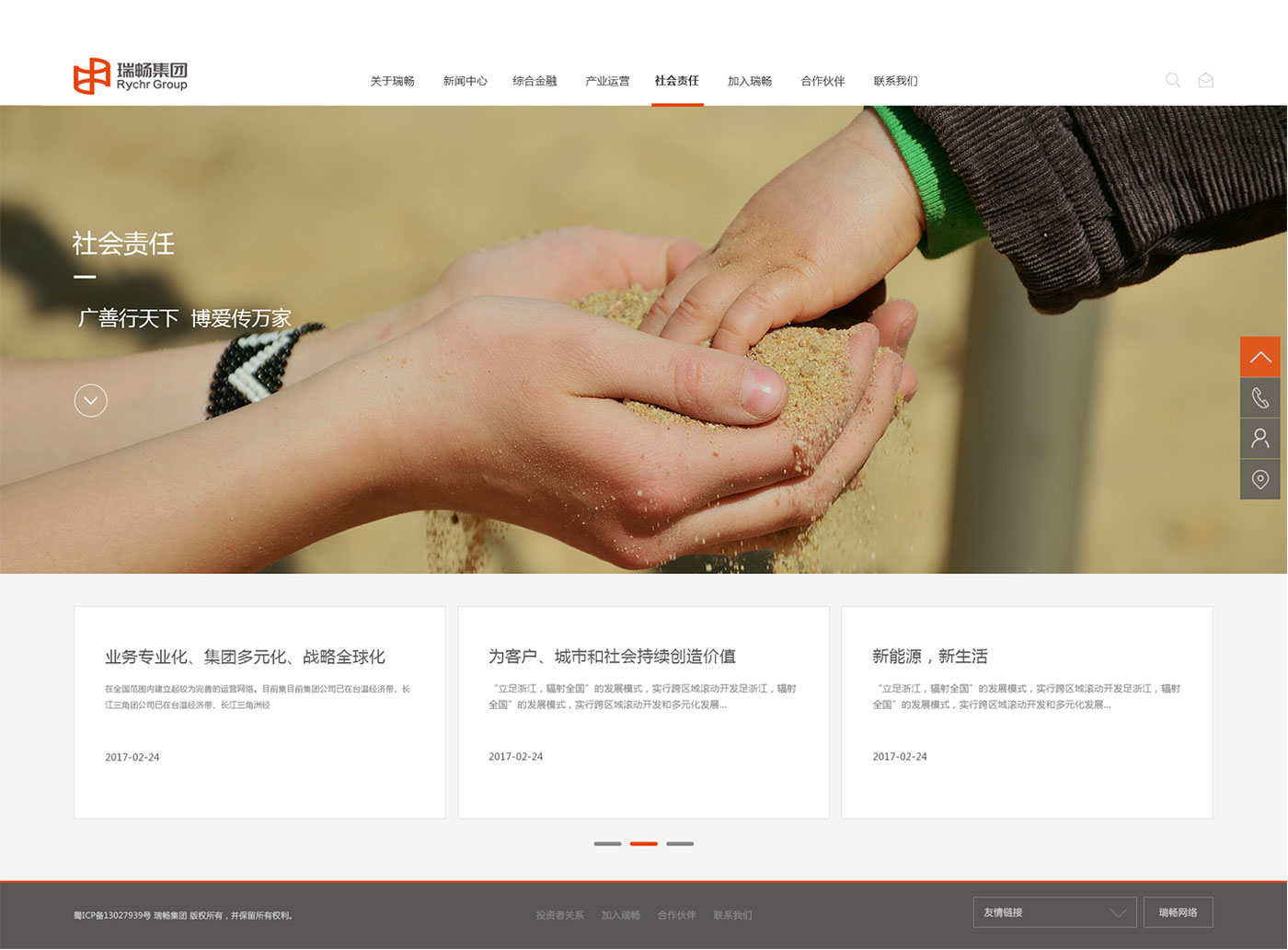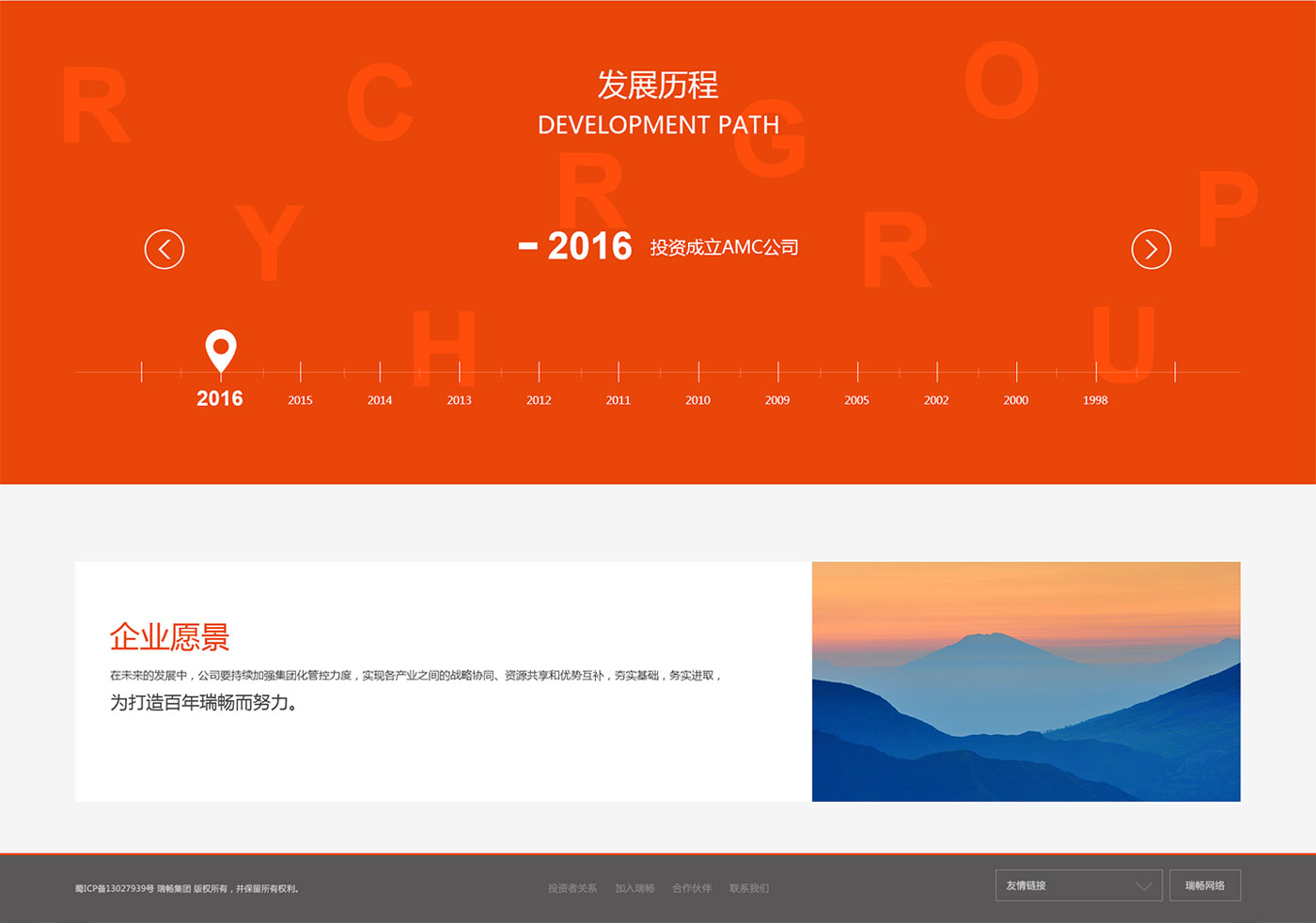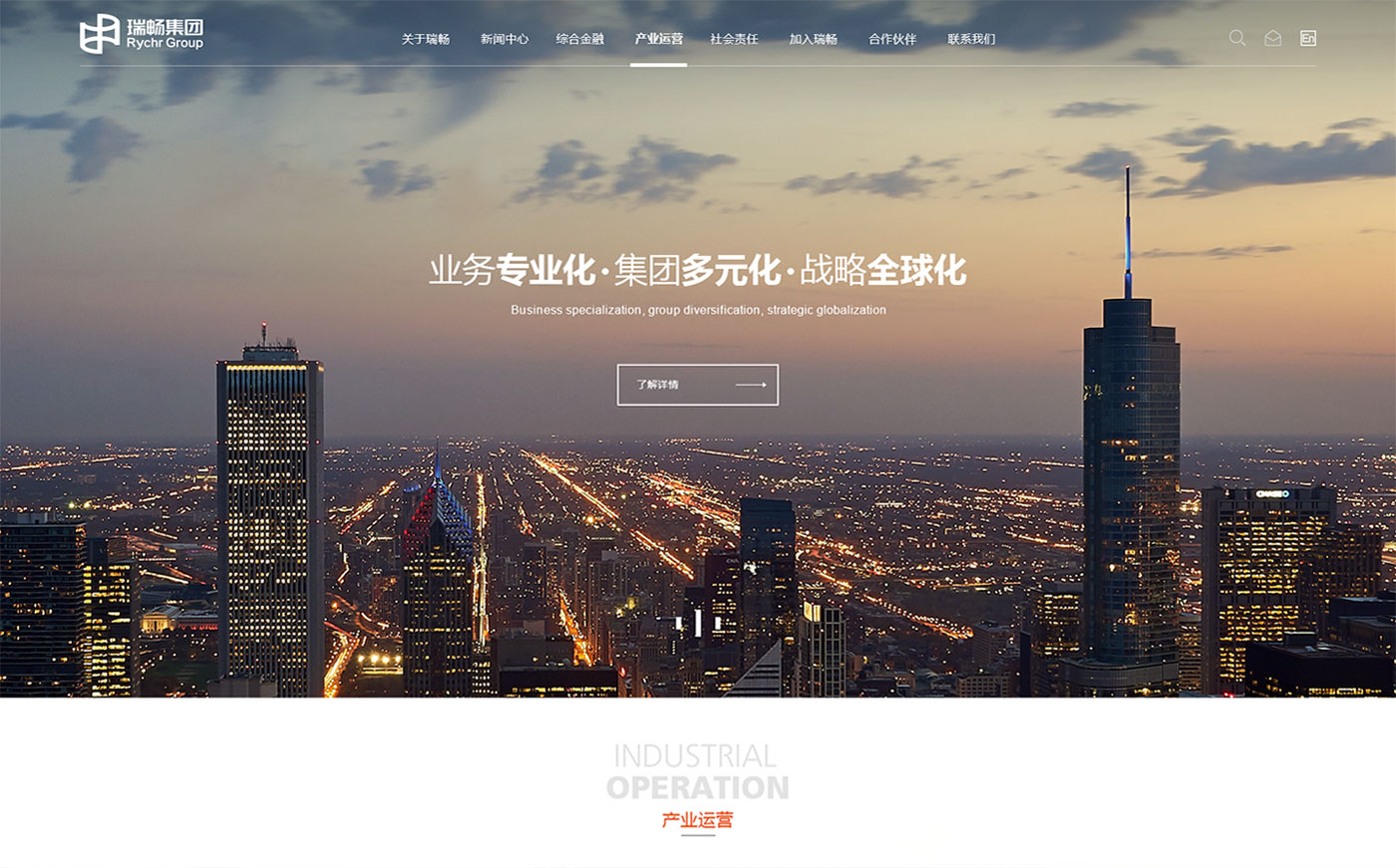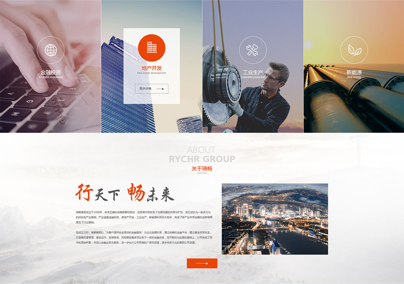 瑞暢集團(tuán)"業(yè)務(wù)專業(yè)化、集團(tuán)多元化、戰(zhàn)略全球化",以簡(jiǎn)約時(shí)尚的風(fēng)格體現(xiàn)瑞暢集團(tuán)走在現(xiàn)代的前沿,流暢的交互使頁面充滿活力更富有吸引力。