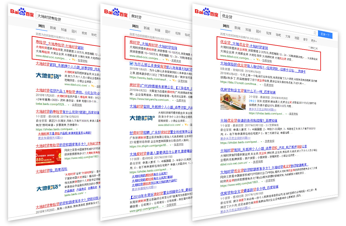 大地時貸網站在建設上線時臨時使用的是三級域名運營了一年的時間,后期公司長久規劃啟動一級域名來進行SEO優化操作。為了把一級域名優化至百度首頁壓制三級域名排位,首先選擇了品牌詞和產品詞進行優化。保證用戶在第一時間搜索品牌詞和產品詞可以看到自然排位的第一名就是大地時貸的官網。